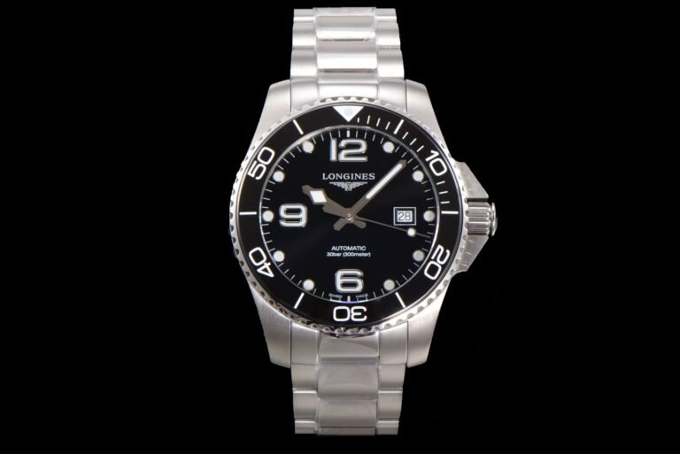 Longines Sports Series L3.781.4.56.6 watch, stainless steel case and bracelet, black ceramic, unidirectional rotating bezel, black sun-patterned dial, 3 Arabic