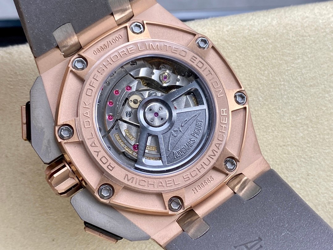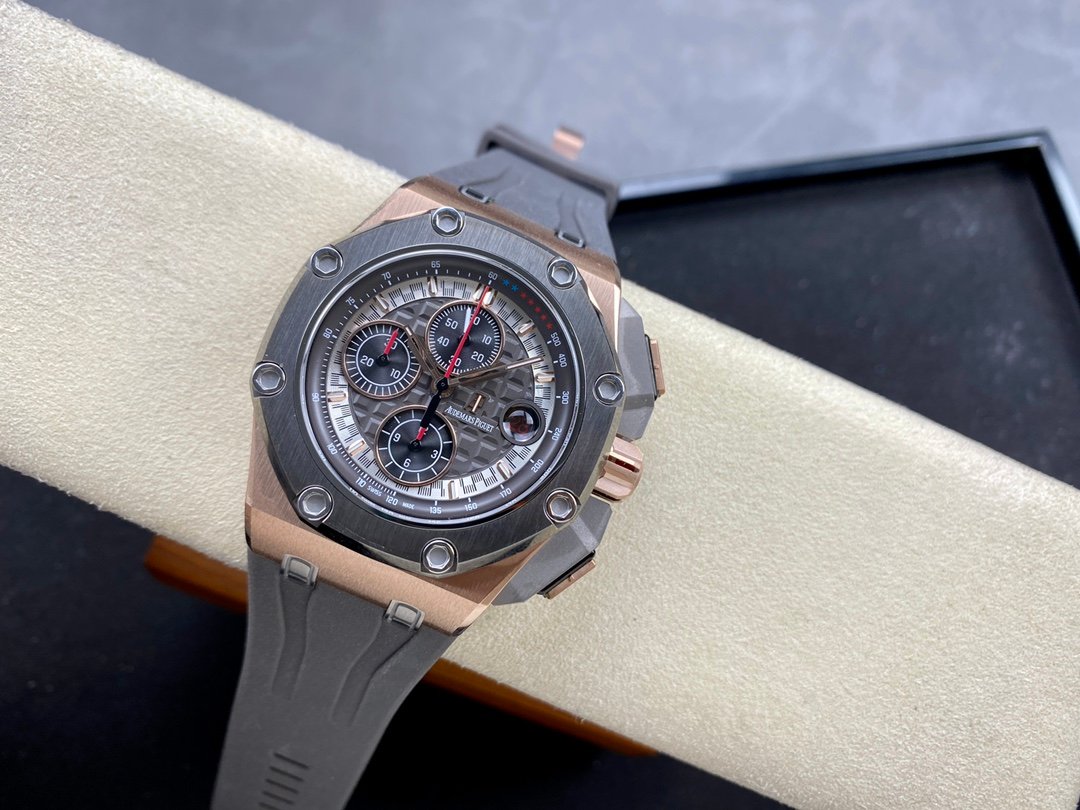 The Audemars Piguet Royal Oak Offshore Chronograph has a case diameter of 44 mm. The one-piece octagonal bezel of this watch is made of Cermet ultra-resistant porcelain, which is seven times more durable than steel, and is fixed with eight automotive-style domed embedded nuts. This watch is also equipped with a uniquely designed rubber strap (grey for titanium and rose gold models, blue for platinum models), connected by micro-beaded and satin-brushed titanium links, which are designed to imitate the cooling air intakes of racing cars, while the micro-beaded crown (made of titanium, rose gold or white gold) is made into a gear-like shape and decorated with a red anodized aluminum bridge engraved with the Audemars Piguet logo. The micro-beaded titanium bridge protects the black polished ceramic buttons, and the top of the button is made of titanium, white gold or rose gold.