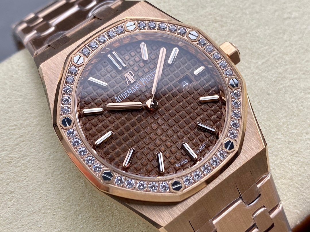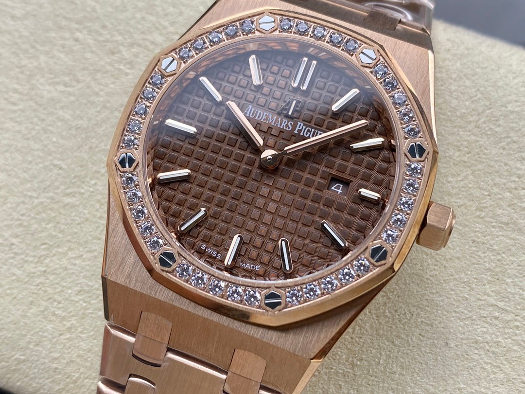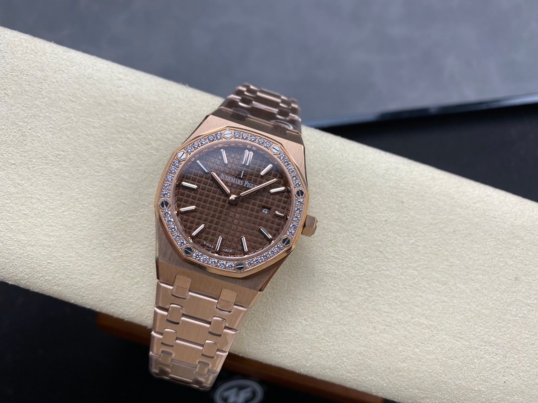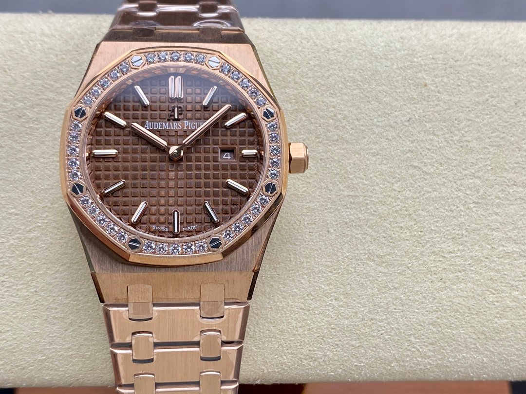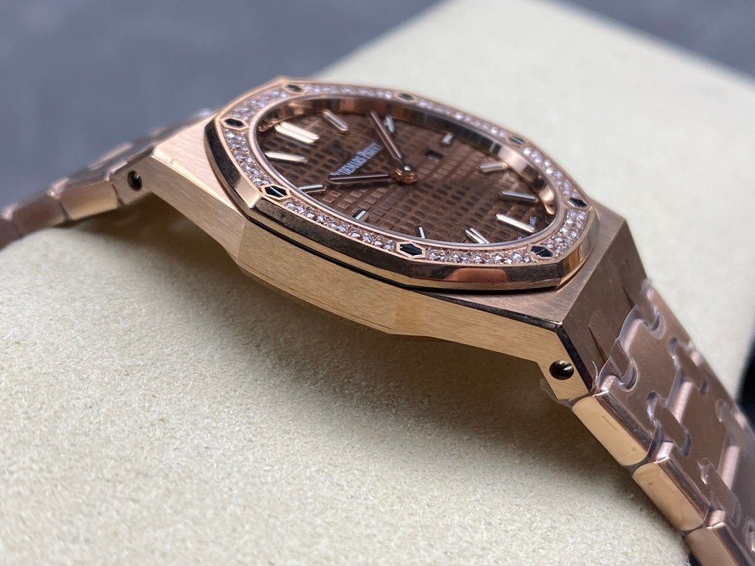 The genuine product is disassembled and molded, and the whole process is CNC polished. The version is adjusted many times, and the edges and corners are clear. The case diameter is 33MM, the polygonal bezel is precisely matched with the case, and the bezel is fixed to the case with hexagonal screws (the bezel is inlaid with exquisite Swarovski diamonds, which are dazzling). The strap links are exquisite and regular, and the links have been carefully polished hundreds of times to present a perfect texture. The folding clasp is easy to open and close, and easy to wear. The watch lugs are bent to ensure that the watch fits the wrist better.