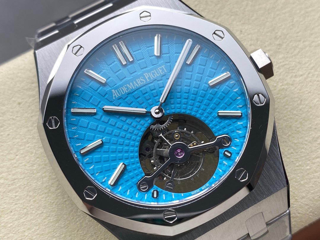 Power reserve 72 hours, Audemars Piguet still retains the octagonal bezel, iconic hexagonal screws and classic strap. The Royal Oak series ultra-thin tourbillon watch has innovated on the classic “Tapsisserie” checkered pattern, forming a new checkered pattern “Tapisserie Evolutive”. The familiar yet unfamiliar dial checkered decoration brings a new look and feel, becoming the finishing touch of this watch. The case diameter is 41 mm and the thickness is 11.2 mm. The extraordinary tourbillon has therefore also been loved and paid attention to by many watch friends.