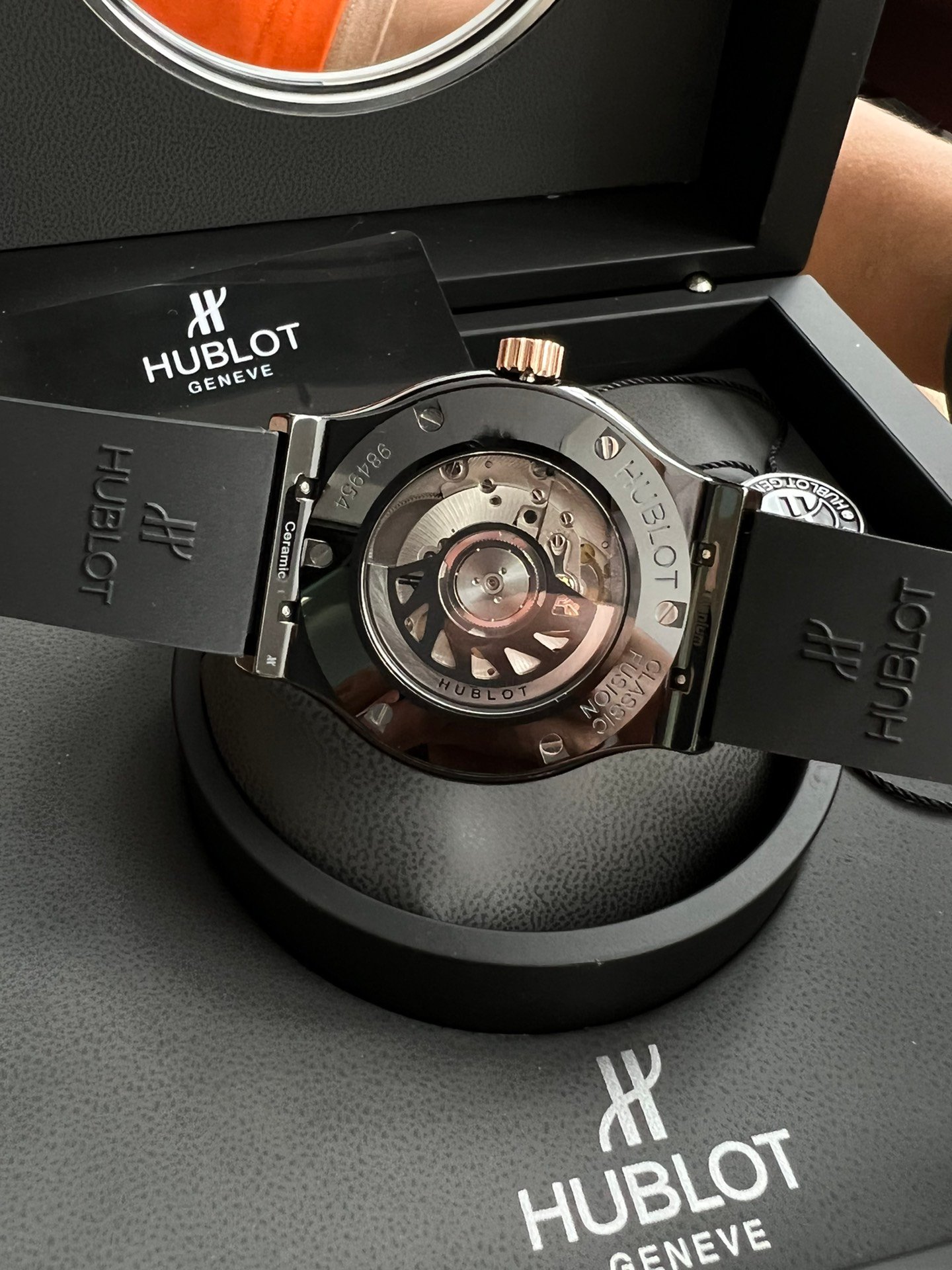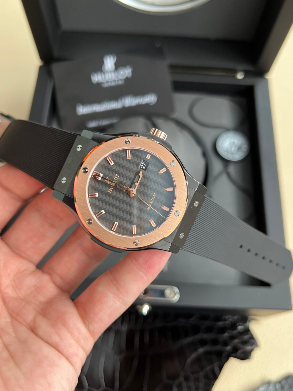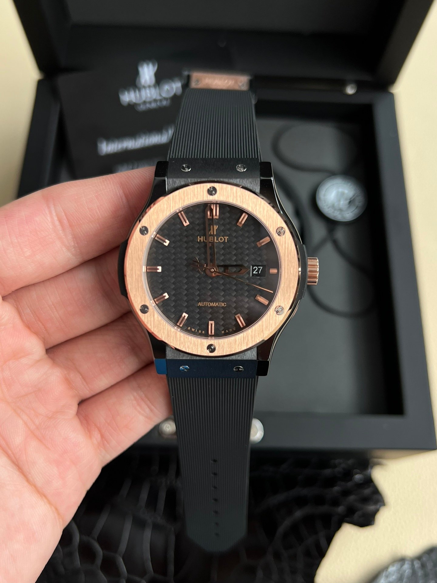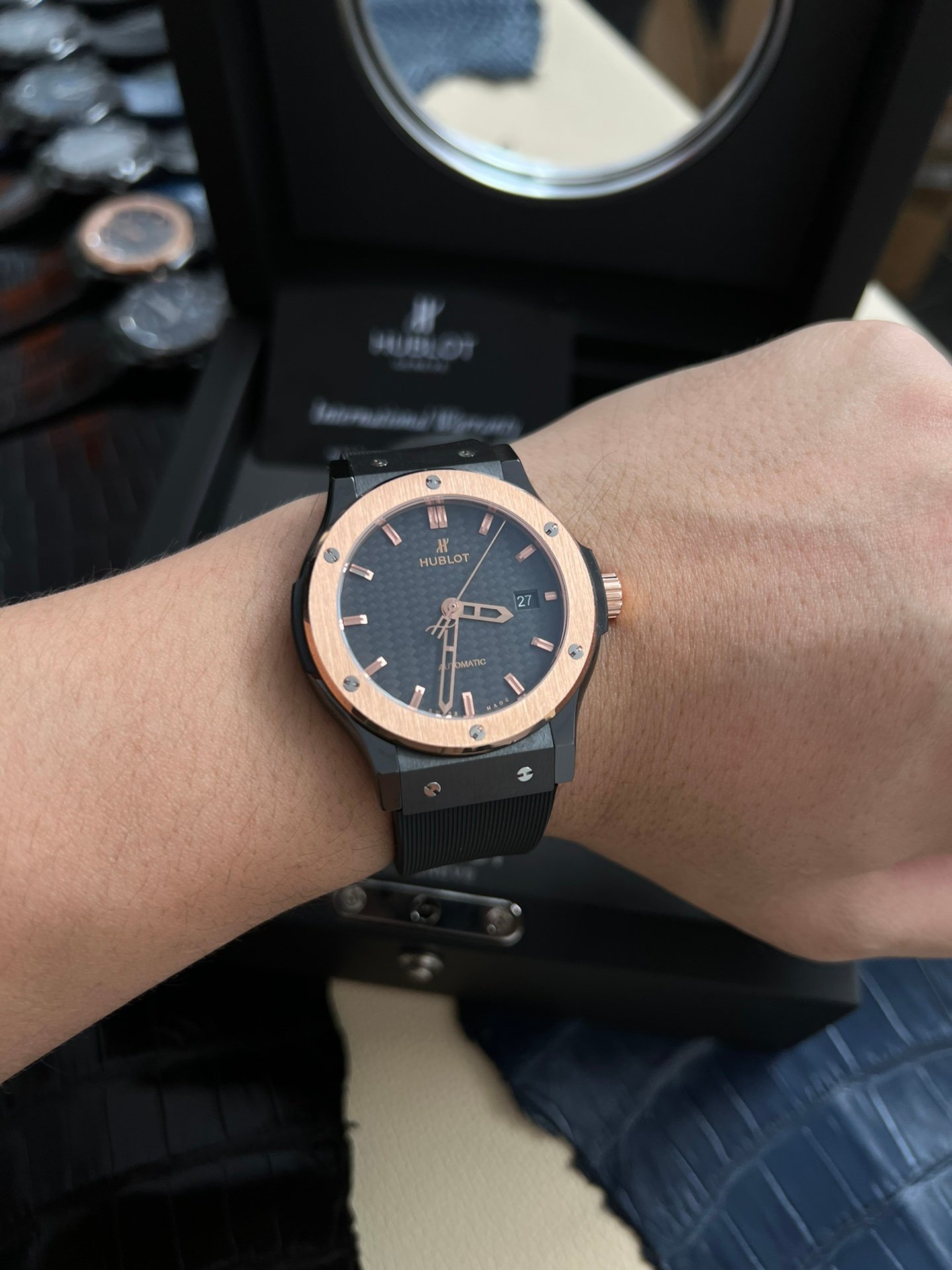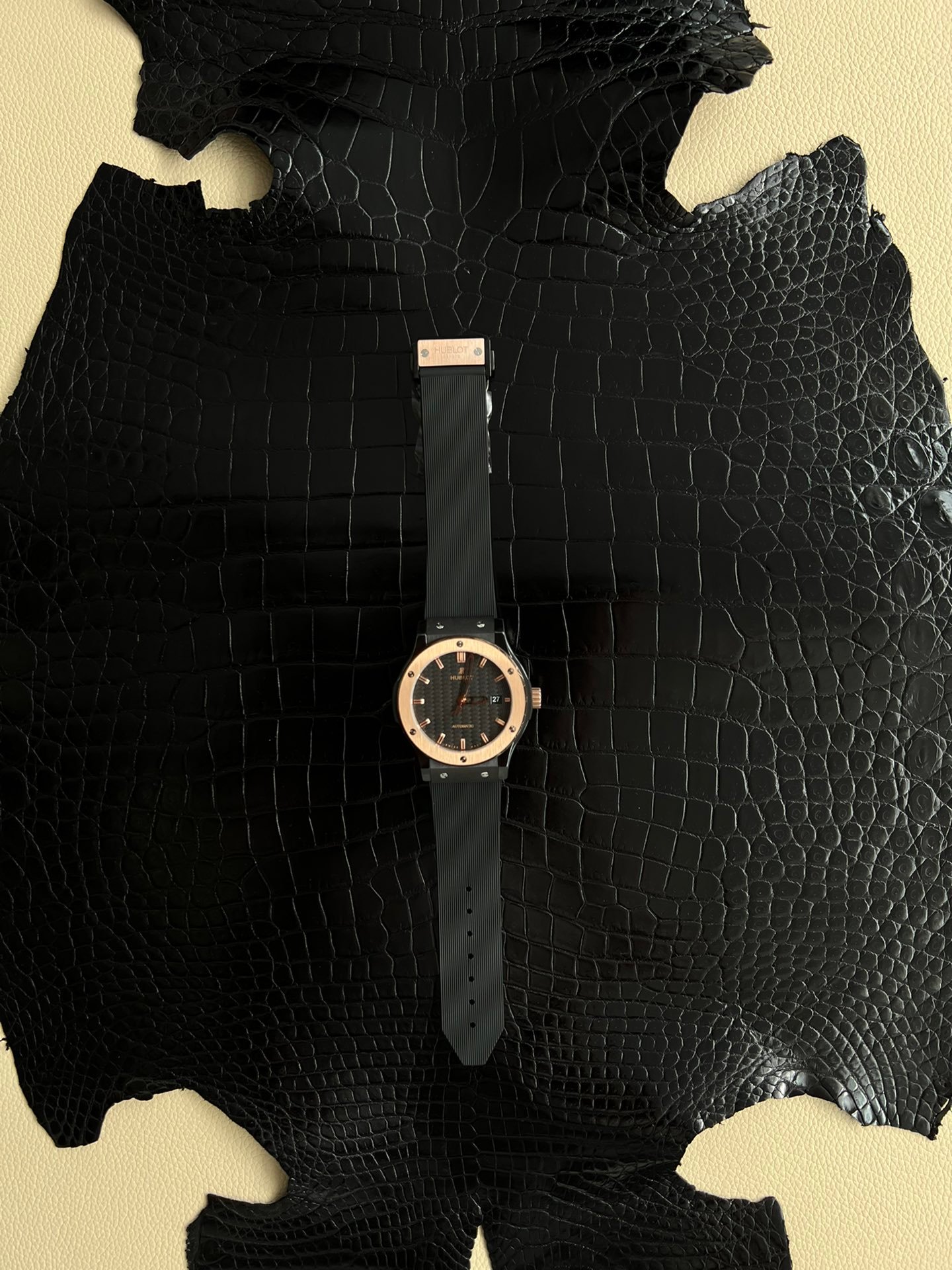 The size is 42MM in diameter. The black ceramic case is as hard as steel. It is not easy to scratch or break. It is wear-resistant and resistant to daily bumps. The case body maintains its gloss all year round. In addition, it comes with 6 H-shaped titanium screws. The crocodile leather strap is combined with smooth, comfortable and soft imported rubber