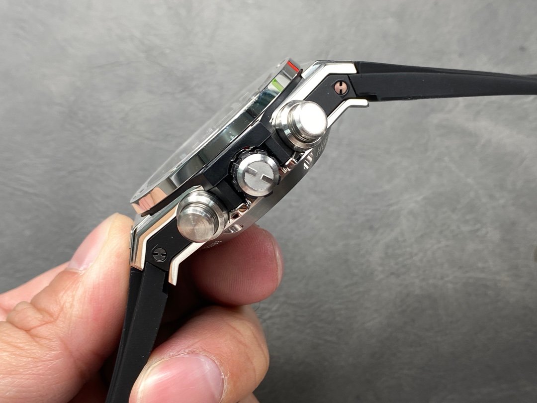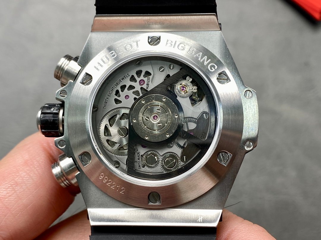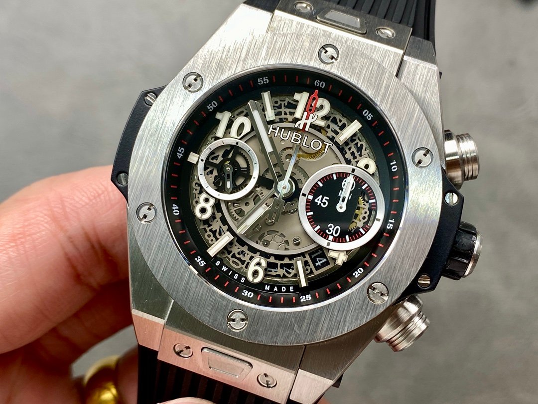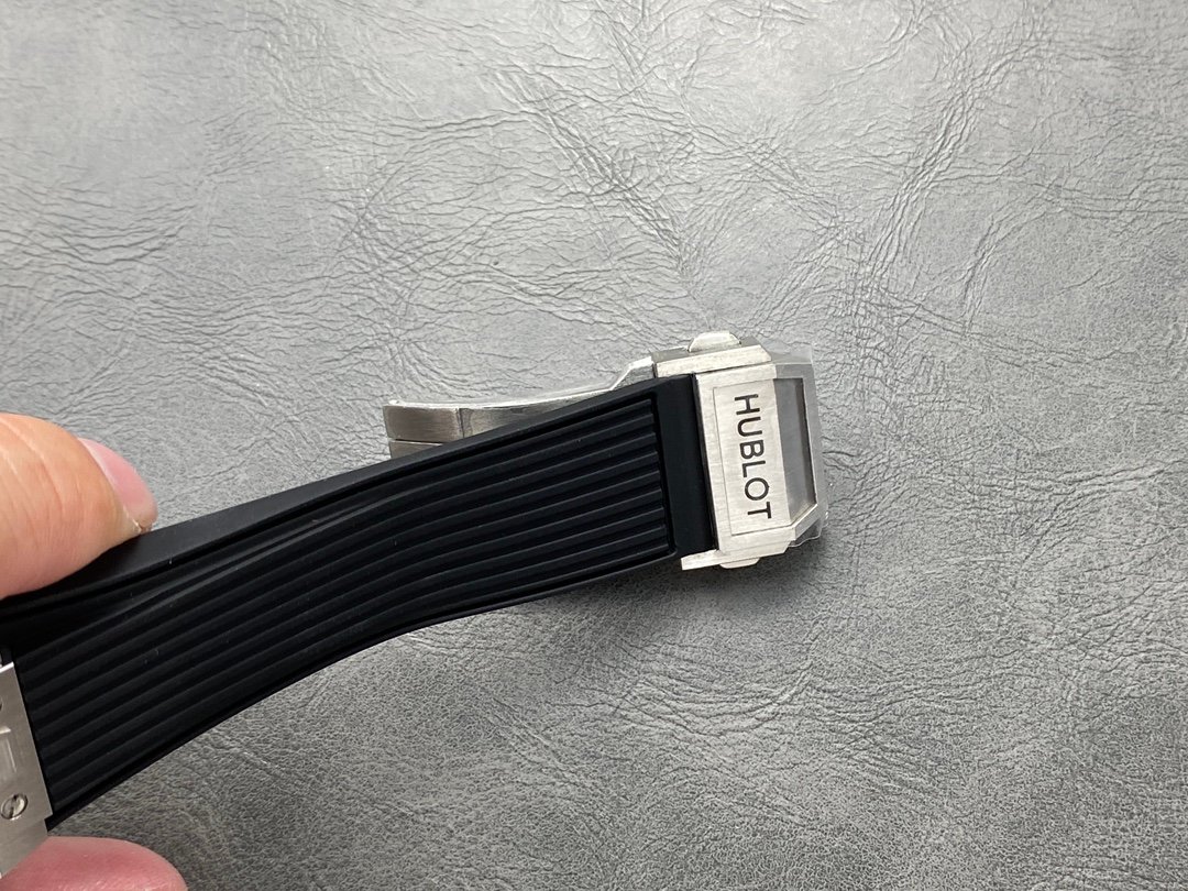 The Hublot watch is equipped with Hublot’s unique manually removable strap, double-bottom sapphire glass, structured lined rubber strap, hollow literal design, the Arabic numerals and hands on the dial are very conspicuous, the strong mechanical texture is clear and easy to read, and the hands and scales have luminous function.