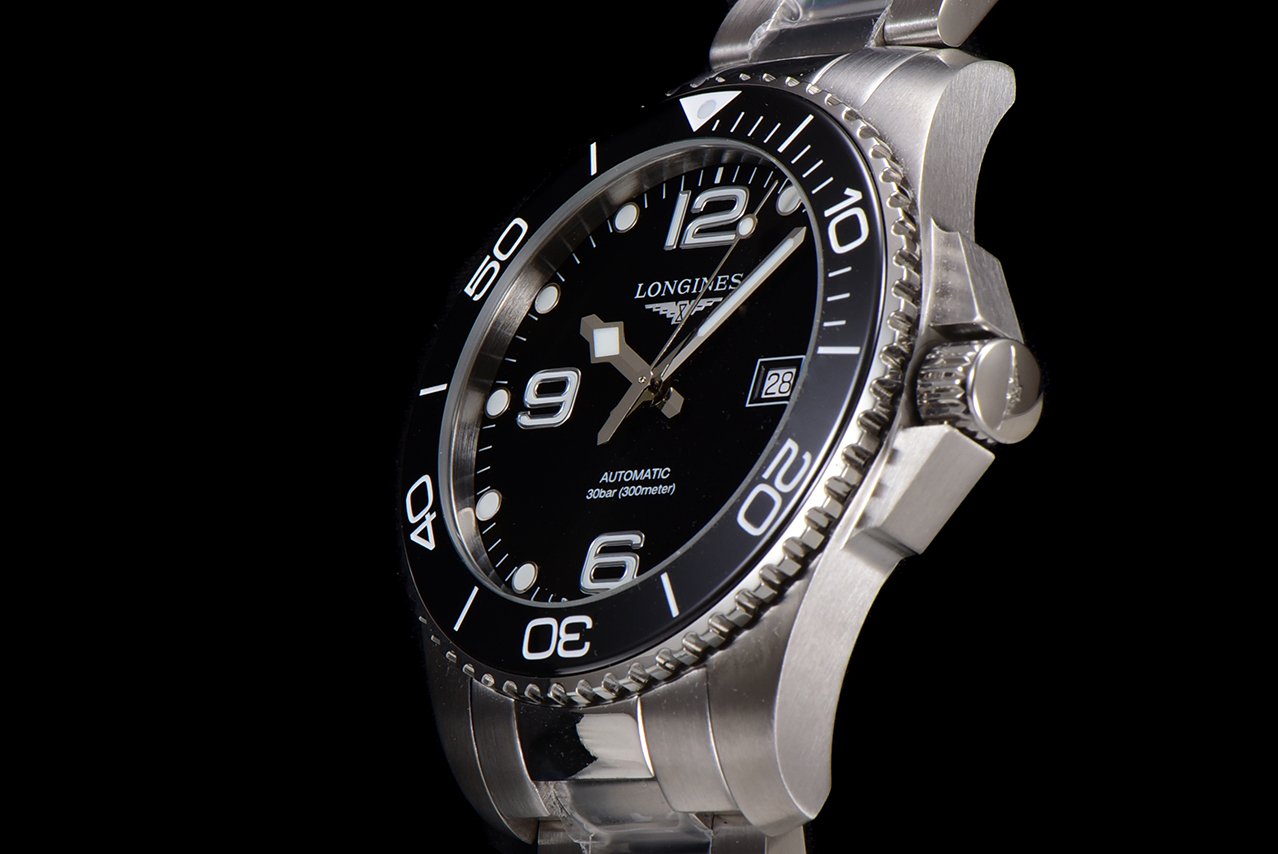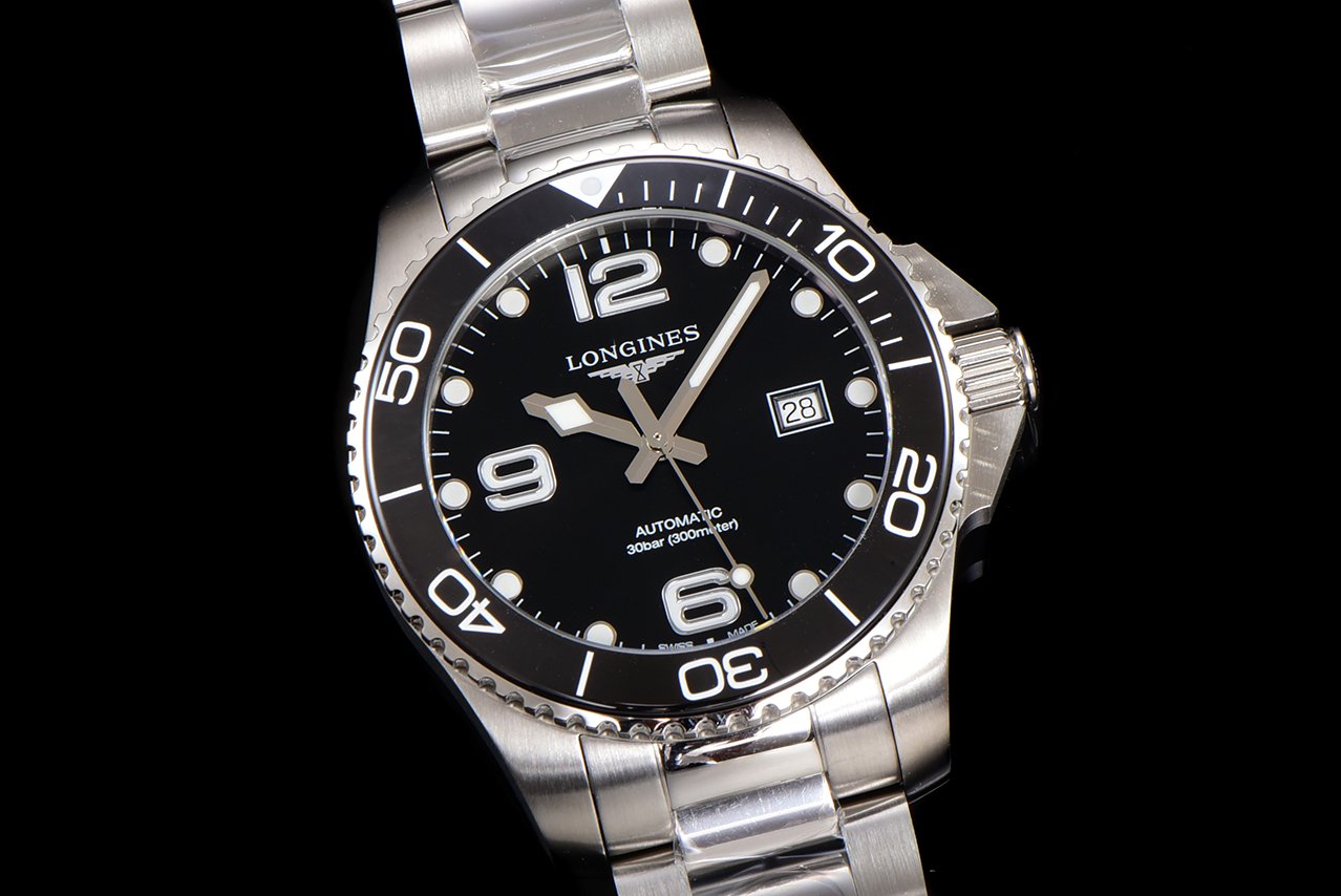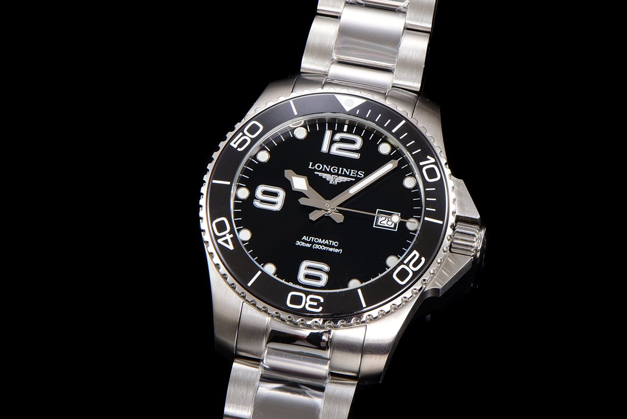 Longines Sports Series L3.781.4.56.6 watch, stainless steel case and bracelet, black ceramic, unidirectional rotating bezel, black sun-patterned dial, 3 Arabic numerals and 10 synthetic gemstone hour markers, covered with Super-LumiNova® luminous coating; rhodium-plated hour, minute and second hands, red chronograph hands, covered with Super-LumiNova® luminous coating 43 mm.
