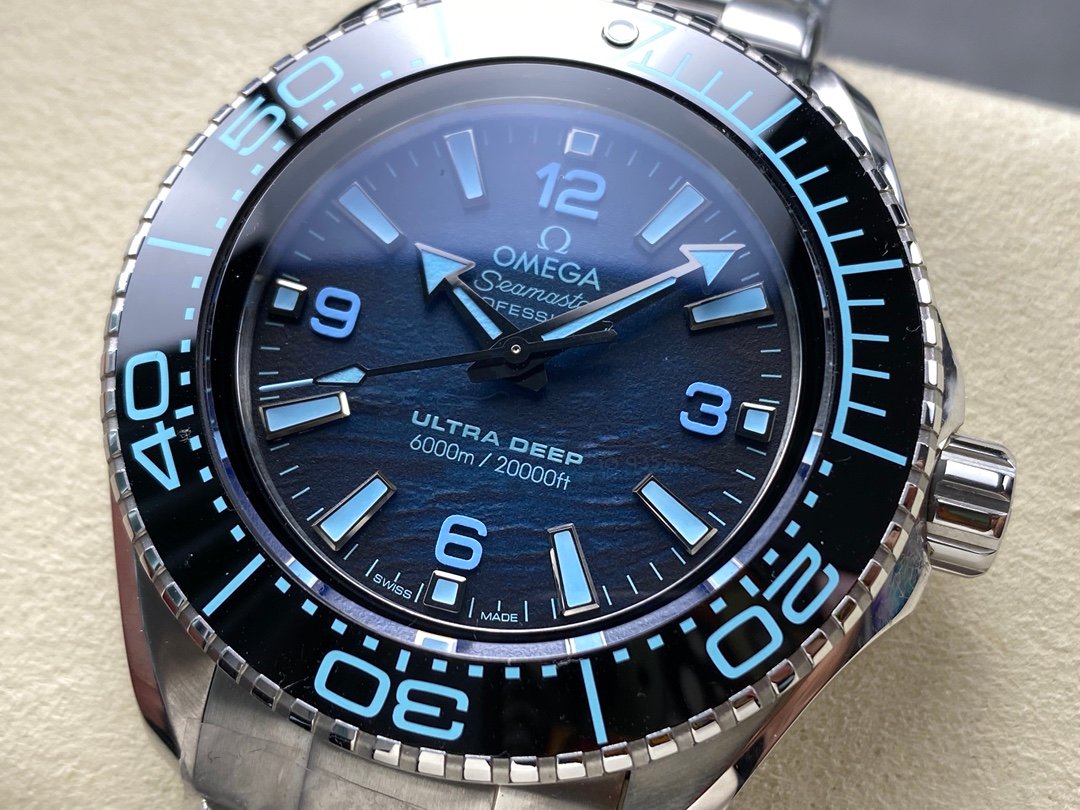 The overall design style and proportions are in line with the Ocean 600 of that year. The slightly raised conical sapphire watch mirror design can better withstand water pressure, and swimming and ordinary diving are completely stress-free! The ceramic bezel uses liquid metal filling technology, a unique design in the industry, and the physical texture will definitely make you love it! All the filling parts of the pointers and scale hour markers have super luminous display, you are the most dazzling star in the dark! The size of the entire watch is 45.5×18 mm. Thanks to the various layered designs on the bezel, case and bottom cover, the entire watch does not look as heavy as imagined from the side. In order to achieve stronger waterproofness, the screw-in bottom cover does not have a back-transparent design. The back cover is laser-printed with a never-fading Poseidon pattern according to different models. The strap has added ergonomic design, and the buckle can be fine-tuned. The entire watch is cast in the original mold, full of details.