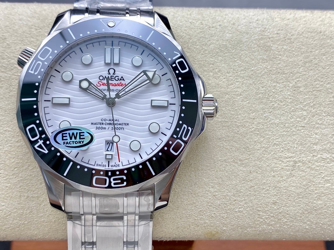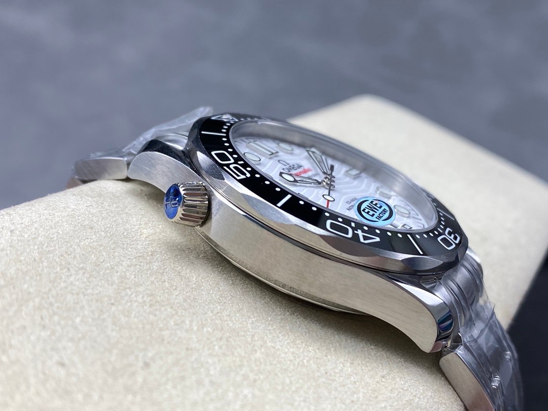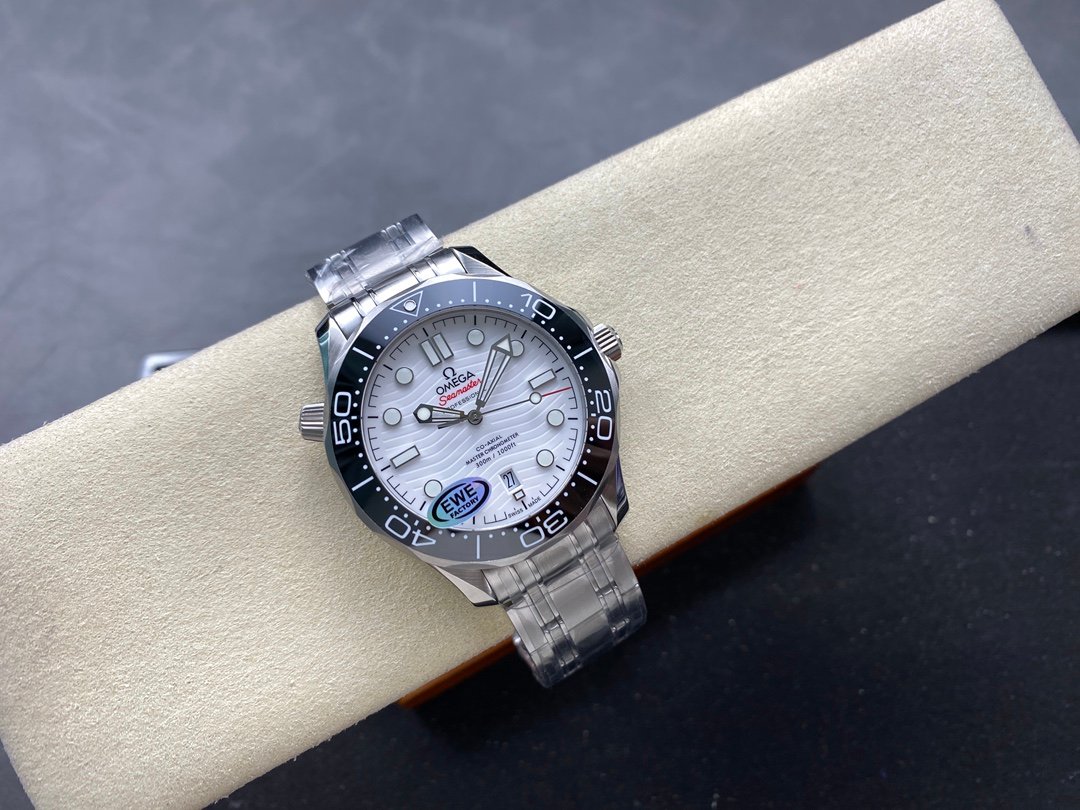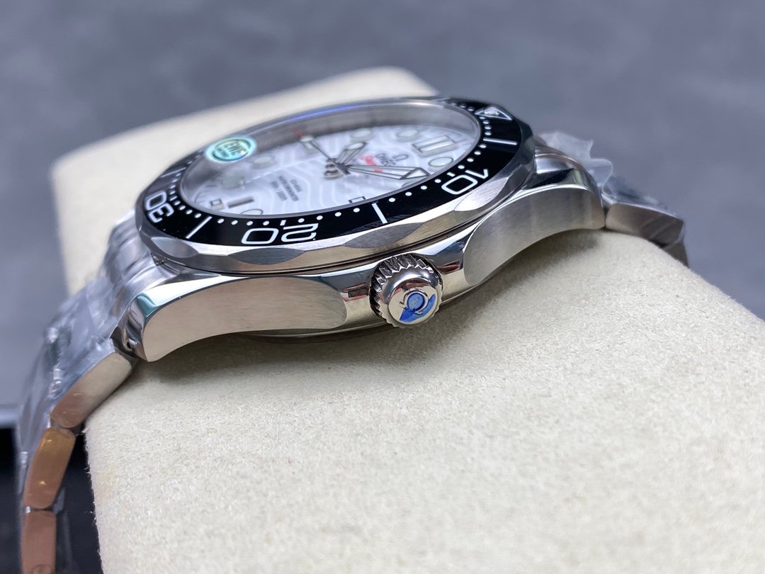 Diving watch 210.30.42.20.01.001 brushed steel case with partial polishing Bezel is made of black ceramic with white enamel diving scale The scale of the letter ring is not easy to wear and fade The ratchet countdown bezel rotates unidirectionally counterclockwise Dome-shaped sapphire mirror is coated with anti-glare film Polished black ceramic dial, laser engraved ripple pattern, calendar window at 6 o’clock, hollow hands and embossed hour markers are rhodium-plated and covered with Super-LumiNova luminous coating, blue and green luminous, minute hand green luminous display and bezel green luminous dots for diving oxygen countdown, multiple waterproof screw-in crowns, can be worn for real sea diving, conical helium exhaust valve, ripple edge design transparent case back movement operation beauty is clearly visible, stainless steel brushed strap, strap removal method is the same as the original with screws on both sides, independent fixing rod design in the middle, folding double snap buckle, with push-to-fine-tune extension, can be worn on the surface of the diving suit when diving in a deep diving suit, watch diameter 42mm
