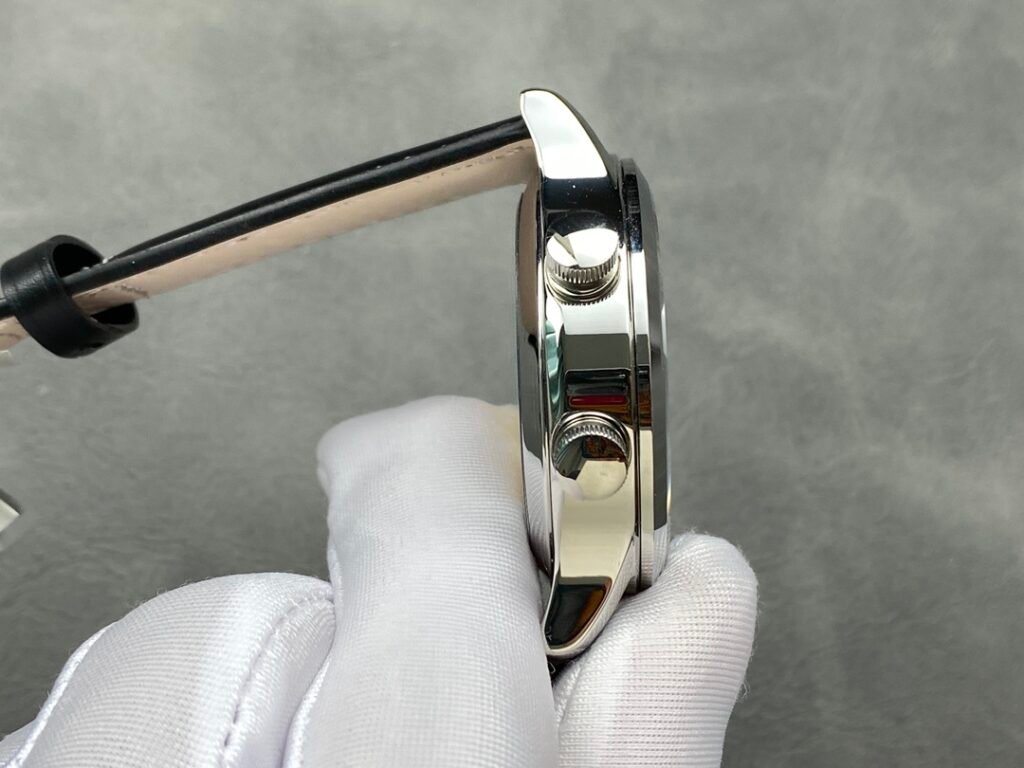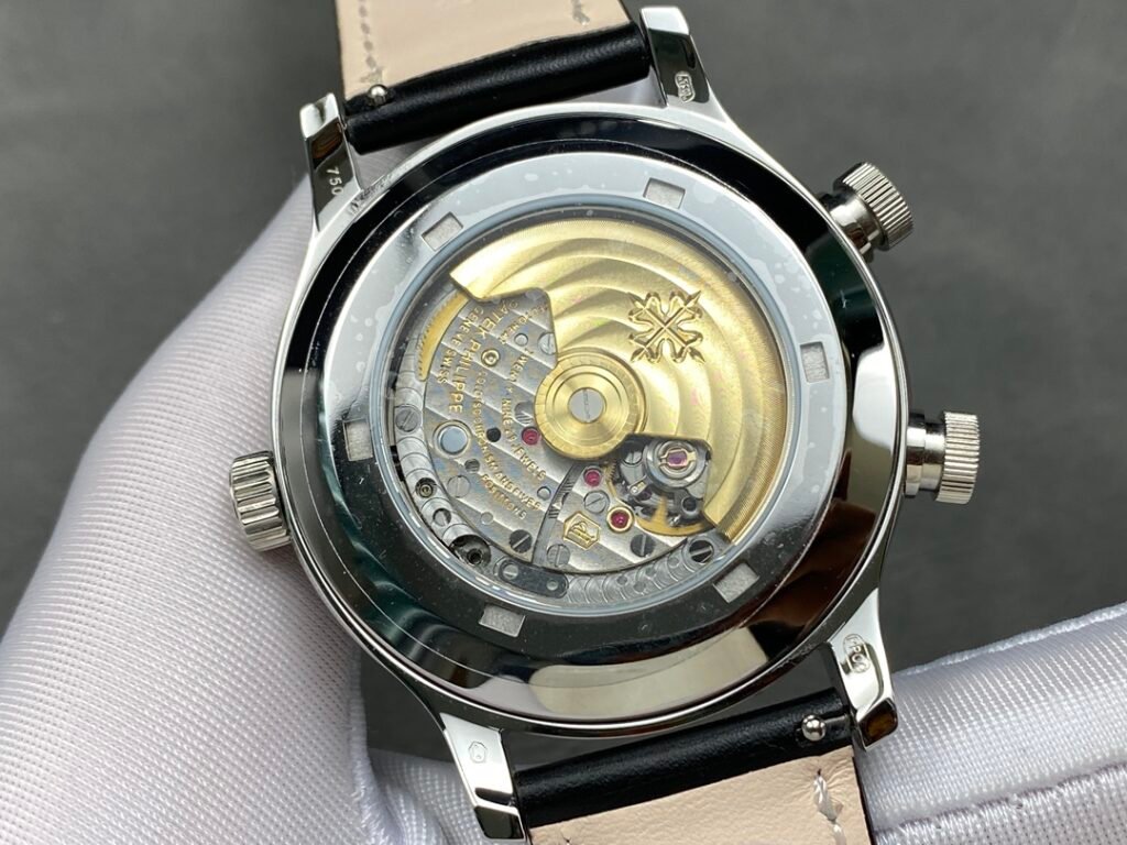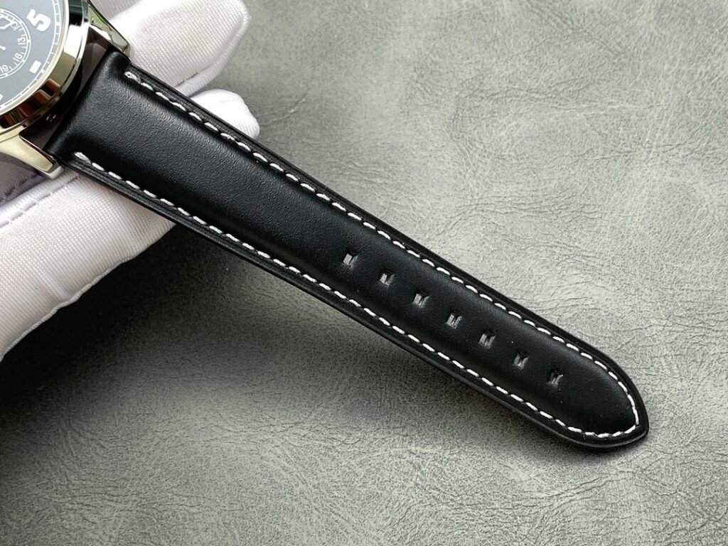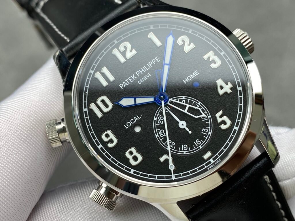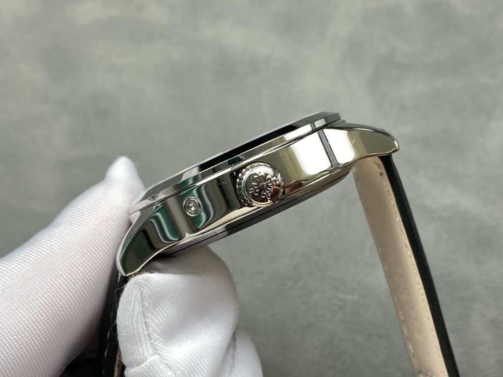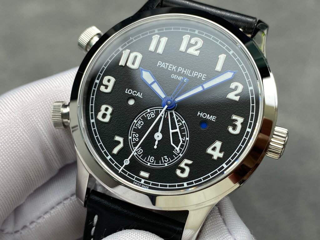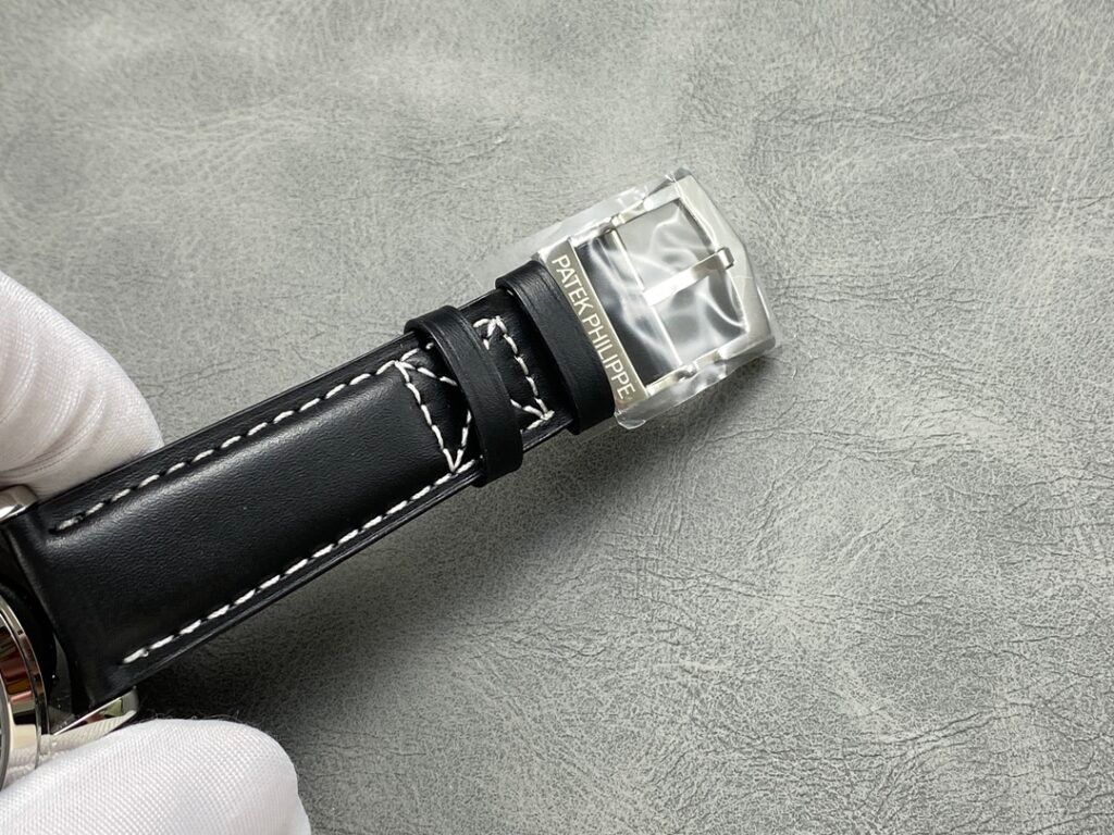 3: Replaceable 5205G lantern folding buckle PP Patek Philippe Multi-function Dual Time Zone Function ref.5524 Calatrava Pilot Travel Time Watch Series is stunningly launched! [Dial] Rose gold coffee dial and dark blue painted dial, the surface has a matte grain texture, exquisite and restrained, and the Arabic fluorescent coating font is also consistent with the original and has a three-dimensional sense, rendering the easy-to-read and rough style of the flight watch to the extreme. [Case] ​​The case is 42mm and 11mm thick, the workmanship is consistent with Patek Philippe’s consistent style, the case is completely mirror polished, smooth and delicate, enhancing its visual sense, and achieving the ultimate in details. [Function] The 5524 series is a 24-hour time watch. The six digits are the same as the original calendar, and the bottom of the center large second hand is a dual time zone time display, which is consistent with the original. [Strap and buckle] The buckle uses a triangular pin buckle that is consistent with the original, which is easy to wear and echoes the case, showing the overall aesthetics of this watch. It is matched with a blue leather strap and decorated with beige stitching. The texture is comfortable, and the cowhide also makes the whole watch more retro. As the first PP pilot watch, the 42 size also shows the tough guy style. It is also a sports style watch and an ideal wrist companion for business travelers.