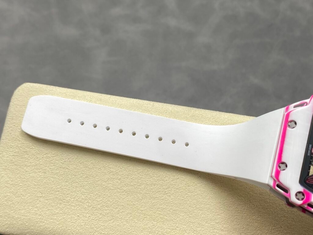 The bezel and bottom cover of the new work are made of pink and white quartz carbon fiber composite materials, and the middle case is made of carbon fiber and pink quartz carbon fiber. Each case has a unique interlaced texture. The ladder barrel case can fit the wrist more comfortably and tightly, and the top of the crown cleverly imitates the concave and convex shape of a golf ball, which is a very interesting detail.