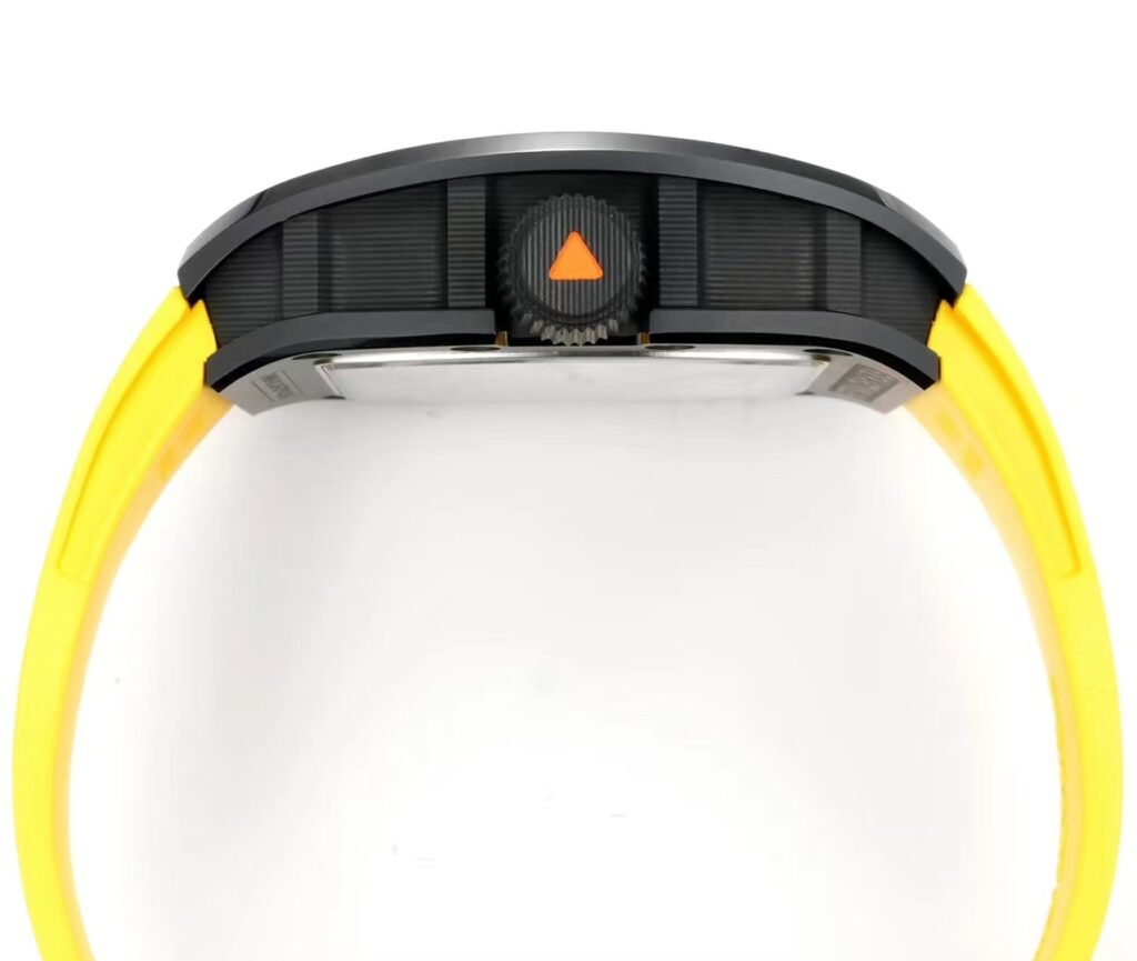 The watch is slightly deformed on the basis of the barrel-shaped case. The entire case is made of grade 5 titanium, with “NTPT” carbon fiber watch ring and black ceramic watch ring. The two arrow pointers have a natural and smooth arc outline, and the tourbillon structure is located at 6 o’clock on the dial.