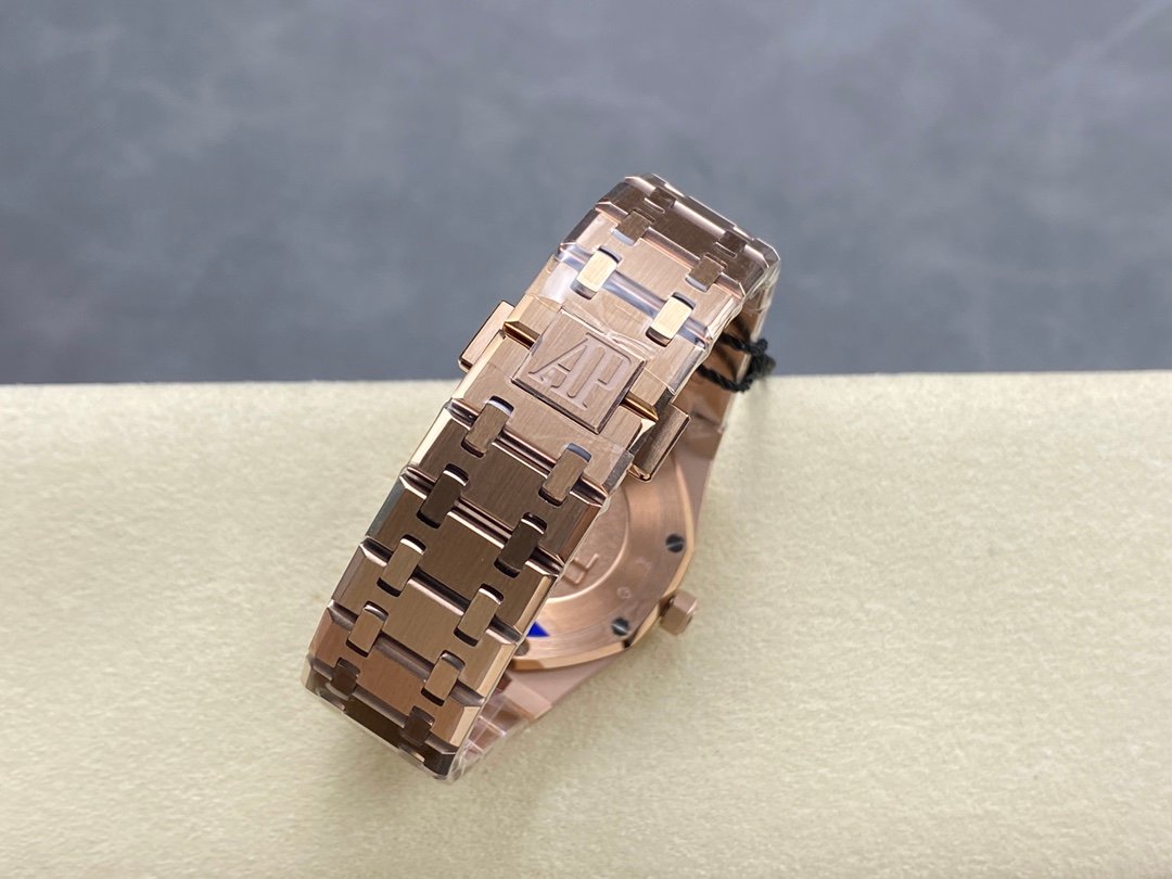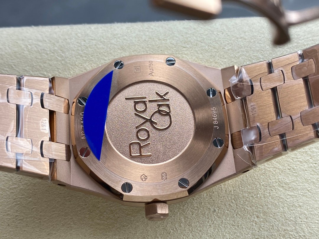 The watch has a closed case back, and the English name of the Royal Oak series “Royal Oak” is engraved on the case back.