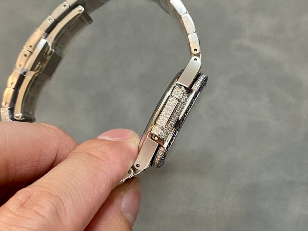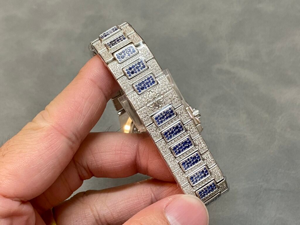 Case and strap: The rare “irregular snowflake inlay” process is used to inlay 1500 brilliant-cut rhinestones and 876 brilliant-cut ruby-sapphire-emerald rhinestones to make the watch more dazzling. This process requires diamonds of different sizes to be inlaid and fixed in place to hide the traces of precious metals before each diamond as much as possible.