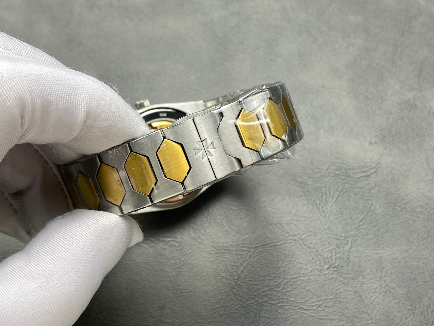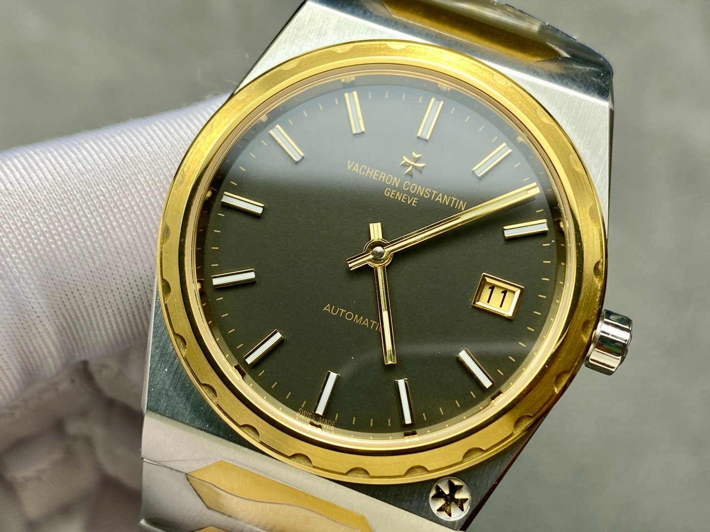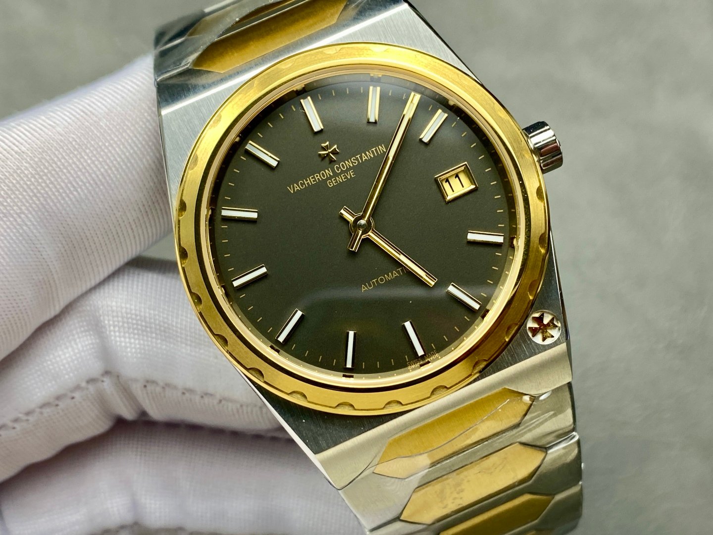 The Old Money Style tonneau-shaped case with the Maltese cross logo at 5 o’clock gives it an understated and exclusive atmosphere Integrated hexagonal central link, semi-domed stainless steel bracelet.